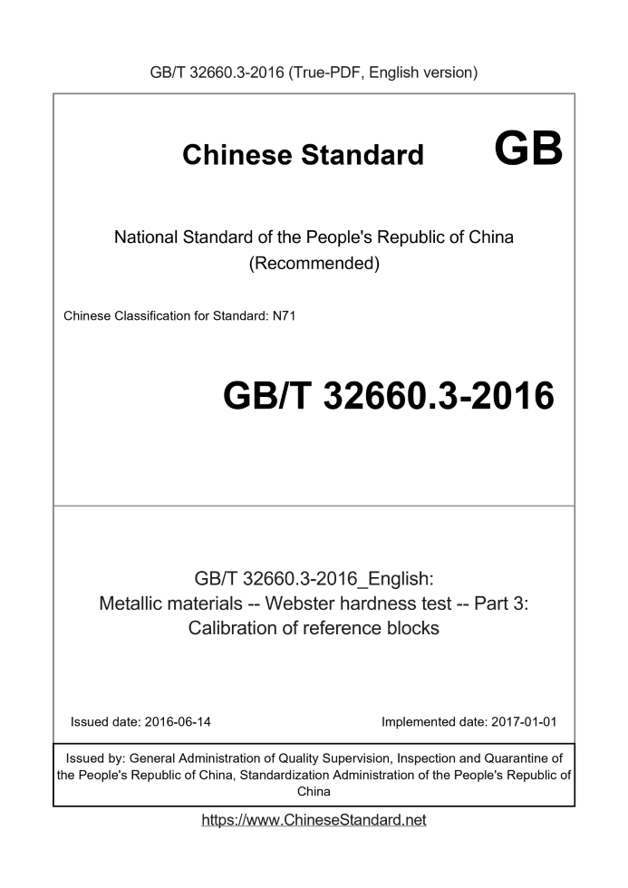 Delivery: <= 3 days. True-PDF full-copy in English will be manually translated and delivered via email. GB/T 32660.3-2016: Metallic materials -- Webster hardness test -- Part 3: Calibration of reference blocks Status: Valid