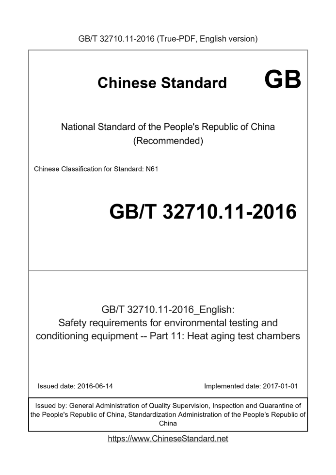 Delivery: <= 4 days. True-PDF full-copy in English will be manually translated and delivered via email. GB/T 32710.11-2016: Safety requirements for environmental testing and conditioning equipment -- Part 11: Heat aging test chambers Status: Valid