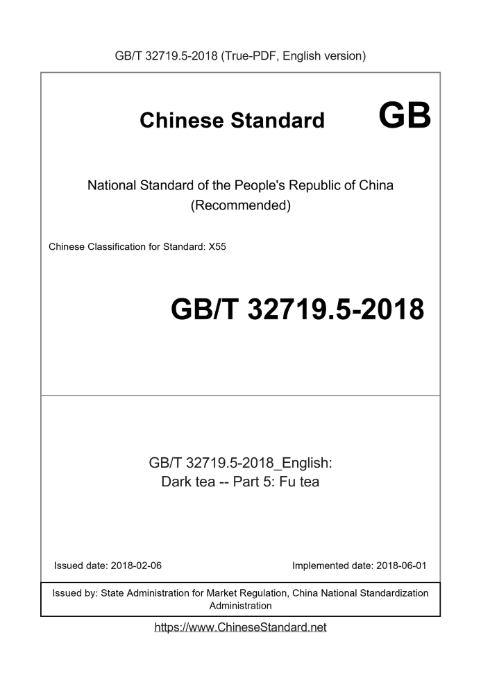 Delivery: <= 3 days. True-PDF full-copy in English will be manually translated and delivered via email. GB/T 32719.5-2018: Dark tea -- Part 5: Fu tea Status: Valid