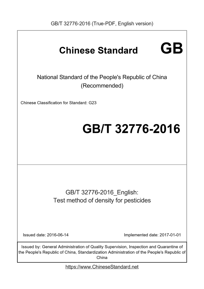 Delivery: <= 3 days. True-PDF full-copy in English will be manually translated and delivered via email. GB/T 32776-2016: Test method of density for pesticides Status: Valid