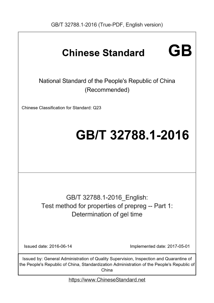 Delivery: <= 3 days. True-PDF full-copy in English will be manually translated and delivered via email. GB/T 32788.1-2016: Test method for properties of prepreg -- Part 1: Determination of gel time Status: Valid