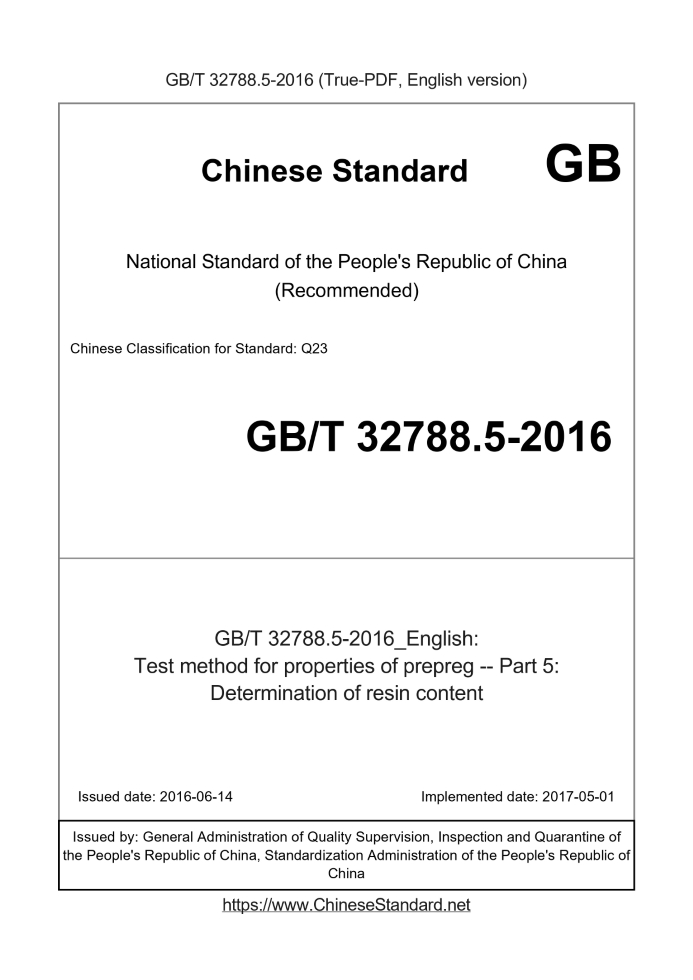 Delivery: <= 3 days. True-PDF full-copy in English will be manually translated and delivered via email. GB/T 32788.5-2016: Test method for properties of prepreg -- Part 5: Determination of resin content Status: Valid