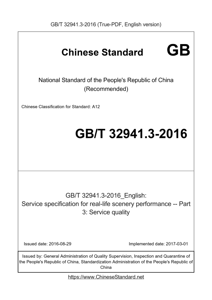 Delivery: <= 2 days. True-PDF full-copy in English will be manually translated and delivered via email. GB/T 32941.3-2016: Service specification for real-life scenery performance -- Part 3: Service quality Status: Valid