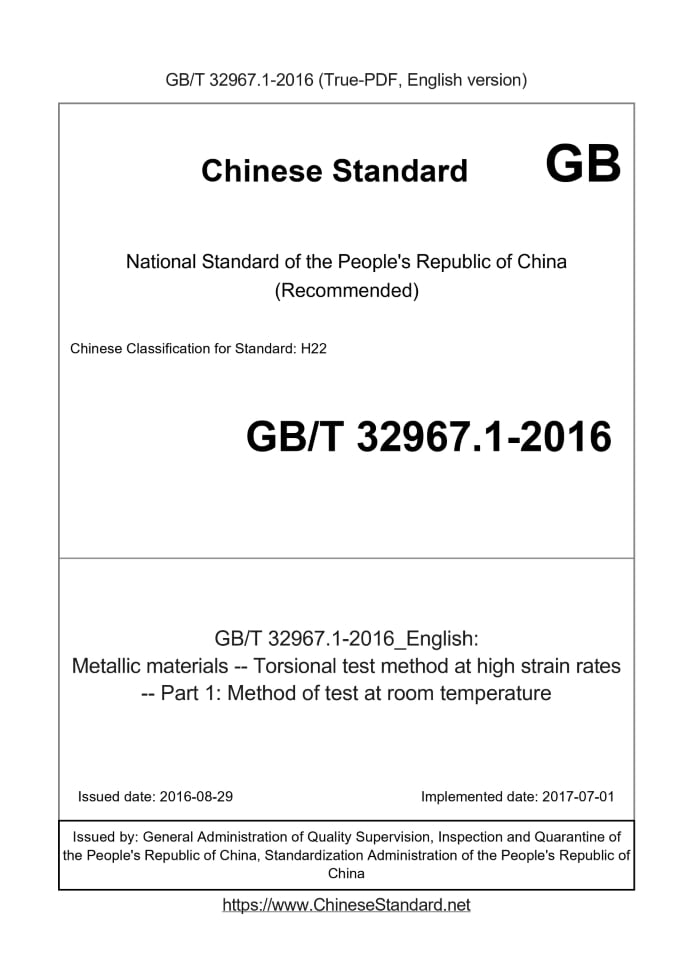 Delivery: <= 1 days. True-PDF full-copy in English will be manually translated and delivered via email. GB/T 32967.1-2016: Metallic materials -- Torsional test method at high strain rates -- Part 1: Method of test at room temperature Status: Valid