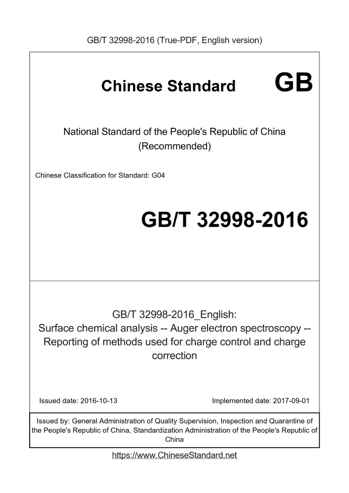 Delivery: <= 3 days. True-PDF full-copy in English will be manually translated and delivered via email. GB/T 32998-2016: Surface chemical analysis -- Auger electron spectroscopy -- Reporting of methods used for charge control and charge correction Status: Valid