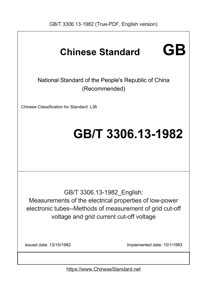 Delivery: <= 2 days. True-PDF full-copy in English will be manually translated and delivered via email. GB/T 3306.13-1982: Measurements of the electrical properties of low-power electronic tubes--Methods of measurement of grid cut-off voltage and grid current cut-off voltage Status: Obsolete