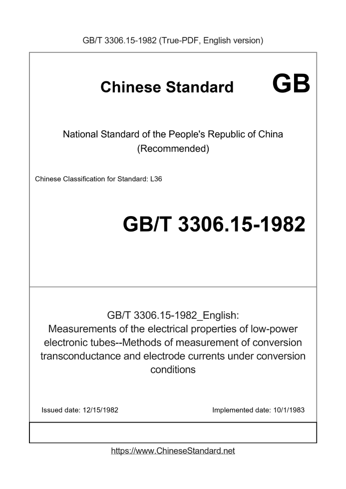 Delivery: <= 2 days. True-PDF full-copy in English will be manually translated and delivered via email. GB/T 3306.15-1982: Measurements of the electrical properties of low-power electronic tubes--Methods of measurement of conversion transconductance and electrode currents under conversion conditions Status: Obsolete
