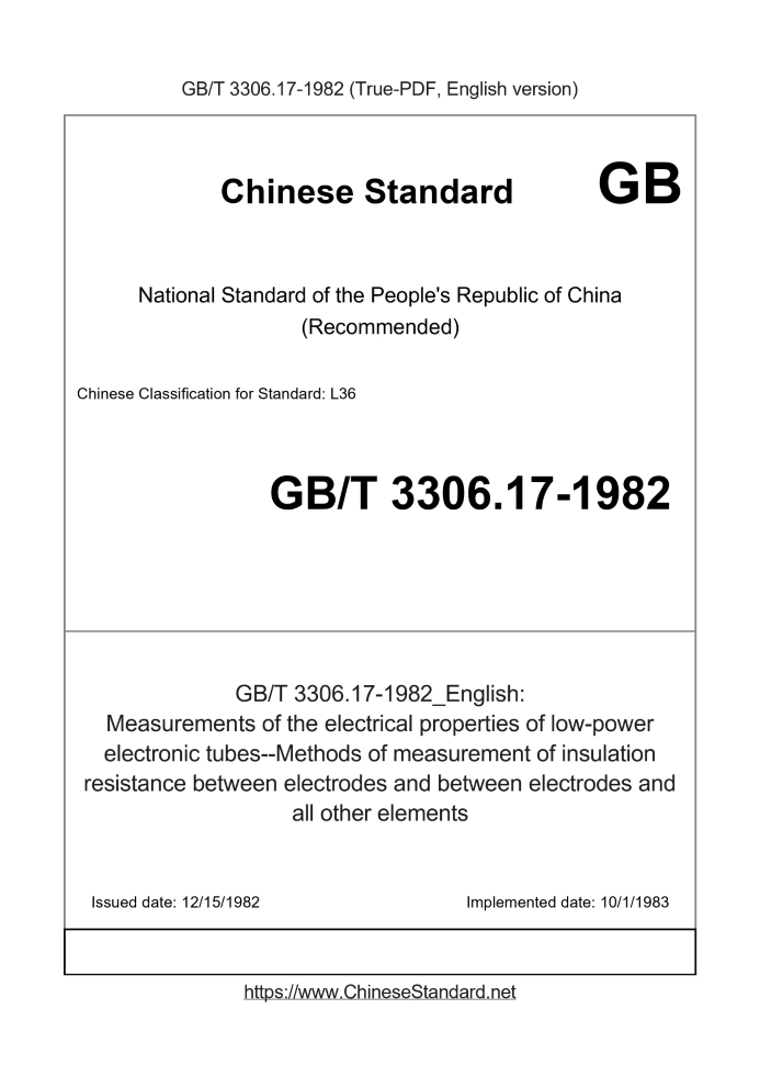 Delivery: <= 2 days. True-PDF full-copy in English will be manually translated and delivered via email. GB/T 3306.17-1982: Measurements of the electrical properties of low-power electronic tubes--Methods of measurement of insulation resistance between electrodes and between electrodes and all other elements Status: Obsolete
