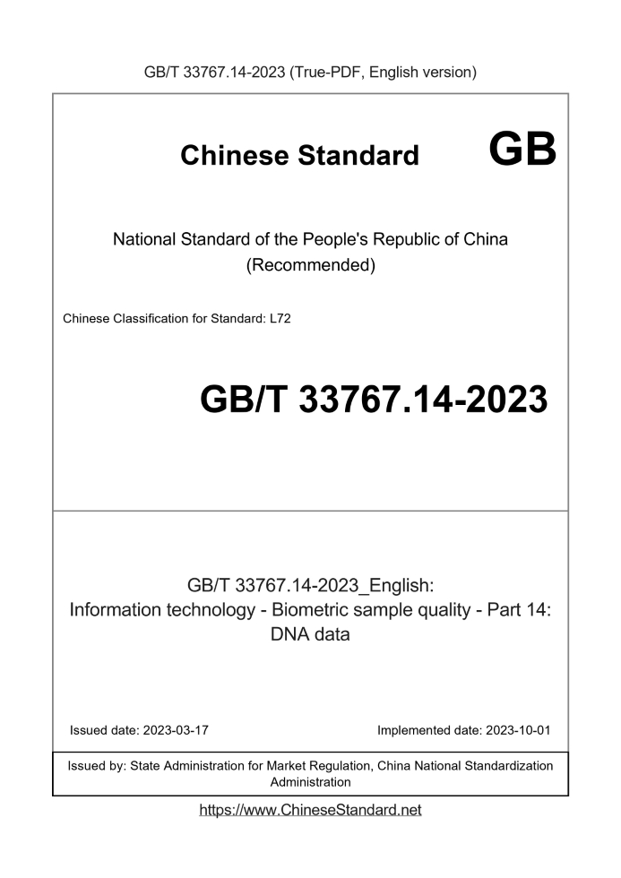 Delivery: <= 3 days. True-PDF full-copy in English will be manually translated and delivered via email. GB/T 33767.14-2023: Information technology - Biometric sample quality - Part 14: DNA data Status: Valid