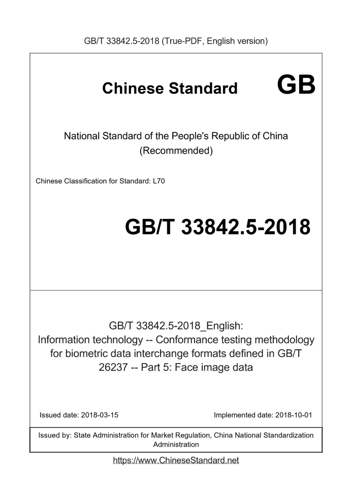 Delivery: <= 5 days. True-PDF full-copy in English will be manually translated and delivered via email. GB/T 33842.5-2018: Information technology -- Conformance testing methodology for biometric data interchange formats defined in GB/T 26237 -- Part 5: Face image data Status: Valid