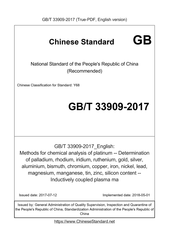Delivery: <= 3 days. True-PDF full-copy in English will be manually translated and delivered via email. GB/T 33909-2017: Methods for chemical analysis of platinum -- Determination of palladium, rhodium, iridium, ruthenium, gold, silver, aluminium, bismuth, chromium, copper, iron, nickel, lead, magnesium, manganese, tin, zinc, silicon content -- Inductively coupled plasma ma Status: Valid