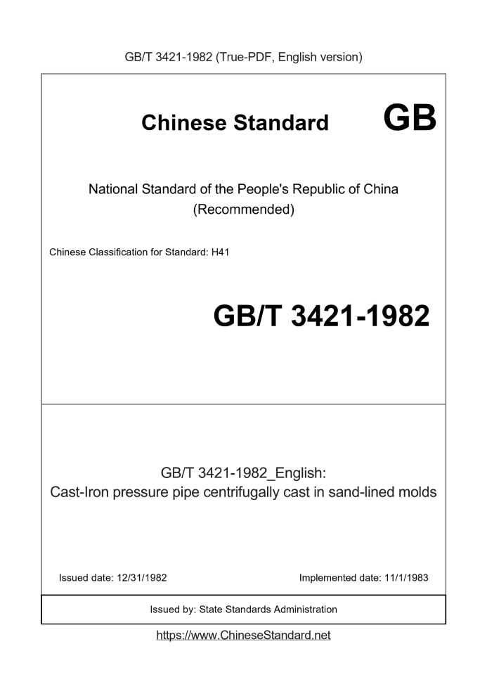 Delivery: <= 2 days. True-PDF full-copy in English will be manually translated and delivered via email. GB/T 3421-1982: Cast-Iron pressure pipe centrifugally cast in sand-lined molds Status: Obsolete