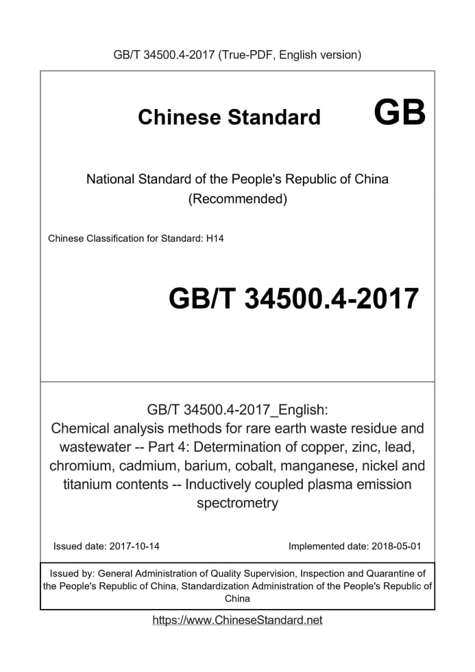 Delivery: <= 3 days. True-PDF full-copy in English will be manually translated and delivered via email. GB/T 34500.4-2017: Chemical analysis methods for rare earth waste residue and wastewater -- Part 4: Determination of copper, zinc, lead, chromium, cadmium, barium, cobalt, manganese, nickel and titanium contents -- Inductively coupled plasma emission spectrometry Status: Valid