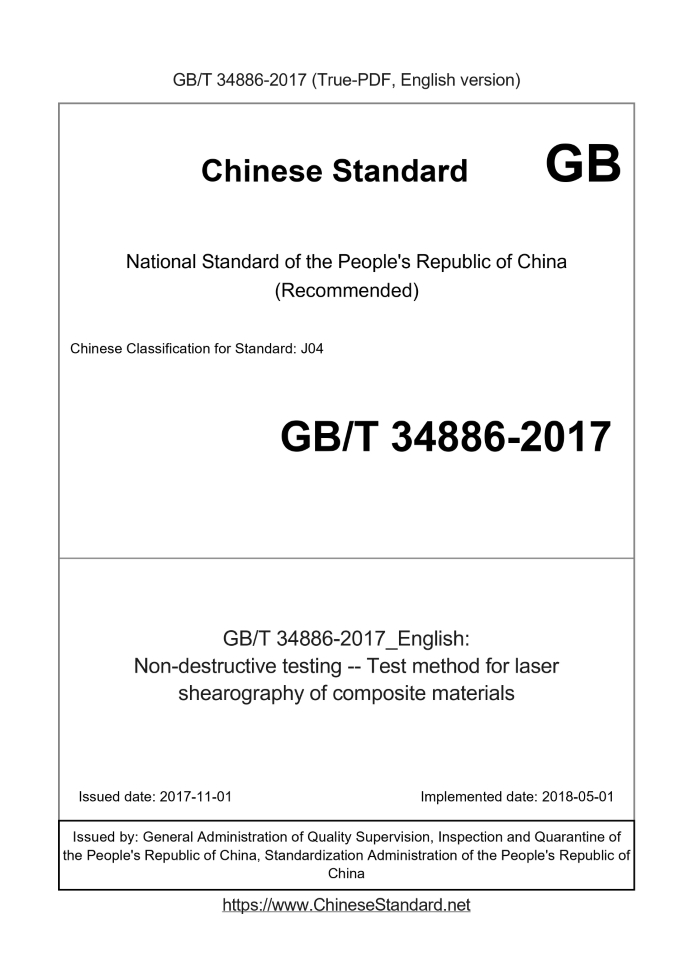 Delivery: <= 4 days. True-PDF full-copy in English will be manually translated and delivered via email. GB/T 34886-2017: Non-destructive testing -- Test method for laser shearography of composite materials Status: Valid