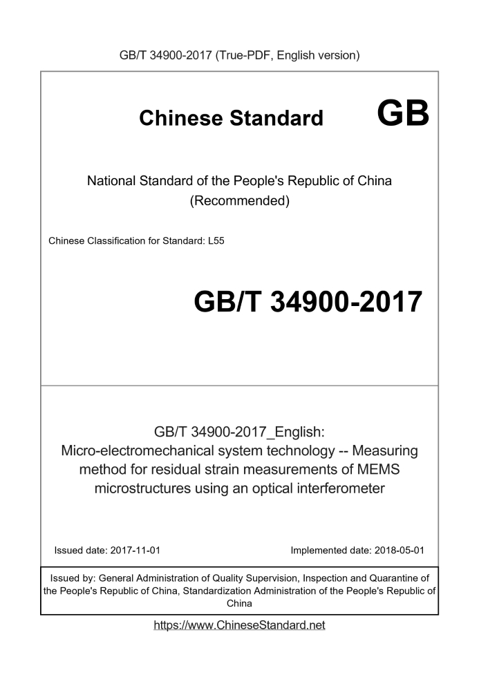 Delivery: <= 3 days. True-PDF full-copy in English will be manually translated and delivered via email. GB/T 34900-2017: Micro-electromechanical system technology -- Measuring method for residual strain measurements of MEMS microstructures using an optical interferometer Status: Valid