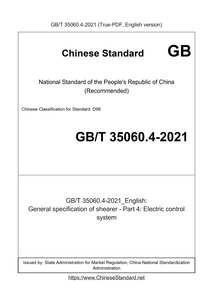 Delivery: <= 4 days. True-PDF full-copy in English will be manually translated and delivered via email. GB/T 35060.4-2021: General specification of shearer - Part 4: Electric control system Status: Valid
