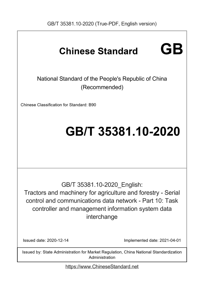Basic dataStandard ID: GB/T 35381.10-2020 (GB/T35381.10-2020)Description (Translated English): Tractors and machinery for agriculture and forestry - Serial control and communications data network - Part 10: Task controller and management information system data interchange Sector / Industry: National Standard (Recommended) Classification of Chinese Standard: B90 Classification of International Standard: 65.060.01; 35.240.99 Word Count Estimation: 194,193 Date of Issue: 2020-12-14 Date of Implementation: 2021-04-01 Regulation (derived from): National Standard Announcement No. 28 of 2020 Issuing agency(ies): State Administration for Market Regulation, China National Standardization Administration GB/T 35381.10-2020: Tractors and machinery for agriculture and forestry - Serial control and communications data network - Part 10: Task controller and management information system data interchange---This is a DRAFT version for illustration, not a final translation. Full copy of true-PDF in English version (including equations, symbols, images, flow-chart, tables, and figures etc.) will be manually/carefully translated upon your order. (Agricultural and forestry tractors and machinery Serial control and communication data network Part 10: Data exchange between task controller and management information system) ICS 65:060:01; 35:240:99 B90 National Standards of People's Republic of China Agriculture and forestry tractors and machinery Serial control and communication data network Part 10: Task Controller and Management Information System Data exchange (ISO 11783-10:2015, MOD) Released on 2020-12-14 Implemented on 2021-04-01 State Administration for Market Regulation Issued by the National Standardization Management Committee Table of contentsPreface Ⅲ 1 Scope 1 2 Normative references 1 3 Terms and definitions 1 4 Abbreviations 3 5 General 3 5:1 Task Management 3 5:2 Task management on FMIS computer 5 5:3 Pre-selection and allocation of equipment 5 5:4 Task Controller Interface Driver 5 5:5 Task Controller User Interface 5 5:6 Data logger function 5 6 Mission Controller Requirements 6 6:1 Task selection and execution 6 6:2 Time and location record 6 6:3 Parameter group record 7 6:4 Task Event Record 7 6:5 Choice of language, format and measurement unit 8 6:6 Connection Management 8 6:7 Task Controller Number 12 6:8 Data exchange on the network 13 7 Data Logger Requirements 23 7:1 Overview 23 7:2 Connection Management 24 7:3 Measurements and totals 24 8 Data transmission 25 8:1 Overview 25 8:2 Extensible Markup Language 25 8:3 Extensible Architecture Definition 25 8:4 XML Schema Definition 26 8:5 XML data transfer file 29 8:6 Binary data transfer file 31 8:7 Device Descriptor Object Pool 36 Appendix A (Normative Appendix) Device Descriptor Object 40 Appendix B (Normative Appendix) Message Definition 47 Appendix C (normative appendix) XML element relationship structure diagram 61 Appendix D (normative appendix) XML elements and attributes 64 Appendix E (Normative Appendix) Pre-defined GB/T 35381 Annex 140 Appendix F (Normative Appendix) Definition of TC Function and Device Descriptor Object Pool 148 Appendix G (Normative Appendix) Task-based time registration 187 References 189ForewordGB/T 35381 "Agricultural and Forestry Tractors and Machinery Serial Control and Communication Data Network" is divided into the following 14 parts: ---Part 1: General Standards for Data Communication; ---Part 2: Physical layer; ---Part 3: Data Link Layer; ---Part 4: Network layer; ---Part 5: Network Management; ---Part 6: Virtual Terminal; ---Part 7: Tool message application layer; ---Part 8: Powertrain news; ---Part 9: Tractor ECU; ---Part 10: Data exchange between task controller and management information system; ---Part 11: Data Element Dictionary; ---Part 12: Diagnostic services; ---Part 13: File Server; ---Part 14: Sequence control: This part is part 10 of GB/T 35381: This section was drafted in accordance with the rules given in GB/T 1:1-2009: This part uses the redrafting law to amend and adopt ISO 11783-10:2015 "Agricultural and forestry tractors and machinery serial control and communication data network Network Part 10: Data Exchange between Task Controller and Management Information System: The technical differences between this part and ISO 11783-10:2015 and the reasons are as follows: ---Regarding normative reference documents, this section has made adjustments with technical differences to adapt to my country's technical conditions and adjustments: The situation is collectively reflected in Chapter 2 "Normative Reference Documents", and the specific adjustments are as follows: ● Replace ISO 11783-1 with GB/T 35381:1 which is equivalent to adopting international standards (see Chapter 3, Chapter 4, 5:3, 5:6 and 7:1); ● Replace ISO 11783-3 with GB/T 35381:3 which is equivalent to the international standard (see 6:6:3, 6:8:1, 8:7 and Appendix B); ● Replace ISO 11783-5 with GB/T 35381:5 equivalent to the international standard (see 6:6:2, 6:6:3, Appendix A and Appendix D); ● Replace ISO 11783-6 with GB/T 35381:6 equivalent to the international standard (see 6:5, 8:6:2, 8:6:4, 8:7, Appendix A And Appendix D); ● Replace ISO 11783-7 with GB/T 35381:7 equivalent to the international standard (see 6:5, 6:6:3, 6:6:5, Appendix A, Record B, Appendix D and Appendix G); ● Replace ISO 11783-11 with GB/T 35381:11 equivalent to the international standard (see 6:8:1, 8:7, Appendix A, Appendix B, Appendix D and Appendix F); ● Replace ISO 11783-12 with GB/T 35381:12, which is equivalent to the international standard (see Appendix A, Appendix D and Appendix F): --- Modify WGS84 to CGS2000 to adapt to my country's technical conditions (see 8:6:4 and Appendix D): ---The Beidou Positioning System (BDS) has been added to adapt to my country's technical conditions (see 6:2, 8:6:3, 8:7, Appendix A and Appendix D): This part was proposed by China Machinery Industry Federation: This part is under the jurisdiction of t