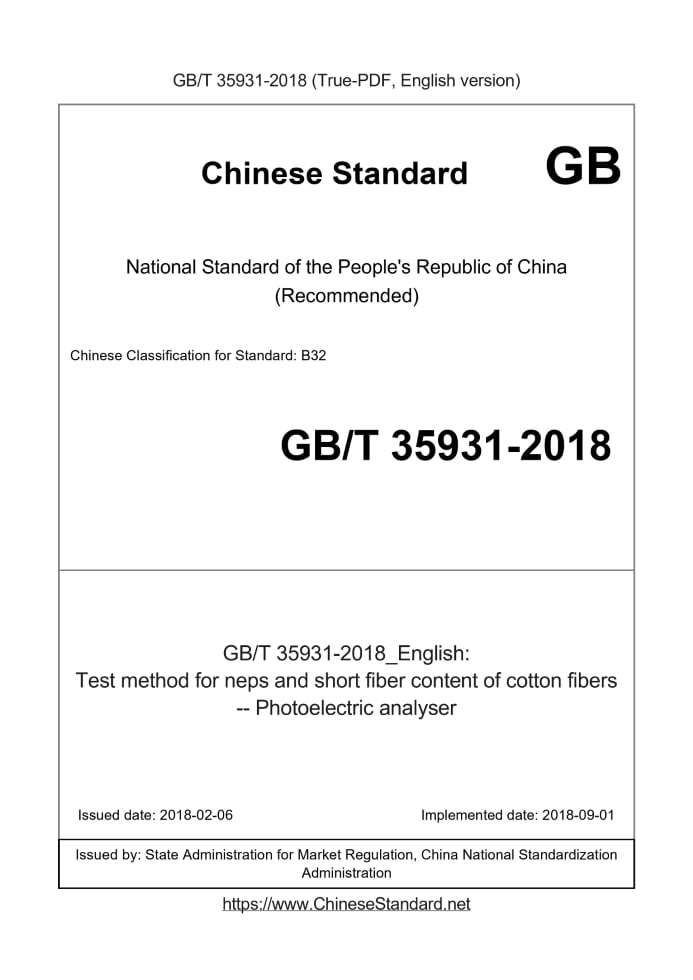 Delivery: <= 3 days. True-PDF full-copy in English will be manually translated and delivered via email. GB/T 35931-2018: Test method for neps and short fiber content of cotton fibers -- Photoelectric analyser Status: Valid