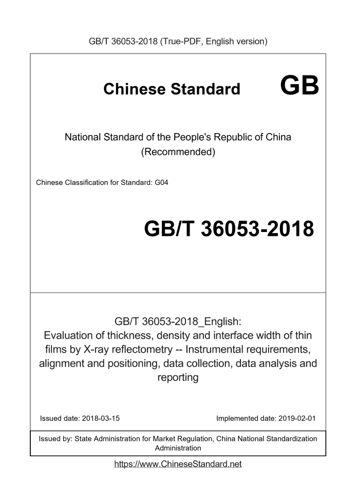 Delivery: <= 5 days. True-PDF full-copy in English will be manually translated and delivered via email. GB/T 36053-2018: Evaluation of thickness, density and interface width of thin films by X-ray reflectometry -- Instrumental requirements, alignment and positioning, data collection, data analysis and reporting Status: Valid