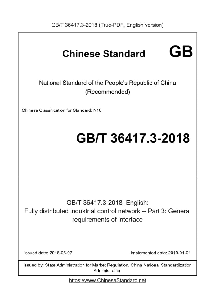 Delivery: <= 3 days. True-PDF full-copy in English will be manually translated and delivered via email. GB/T 36417.3-2018: Fully distributed industrial control network -- Part 3: General requirements of interface Status: Valid