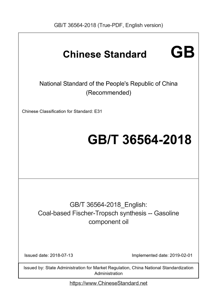 Delivery: <= 3 days. True-PDF full-copy in English will be manually translated and delivered via email. GB/T 36564-2018: Coal-based Fischer-Tropsch synthesis -- Gasoline component oil Status: Valid