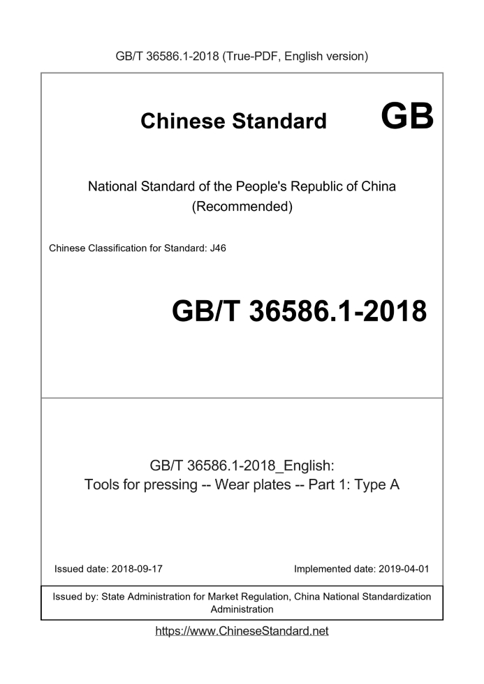 GB/T 36586.1-2018: Tools for pressing -- Wear plates -- Part 1: Type A