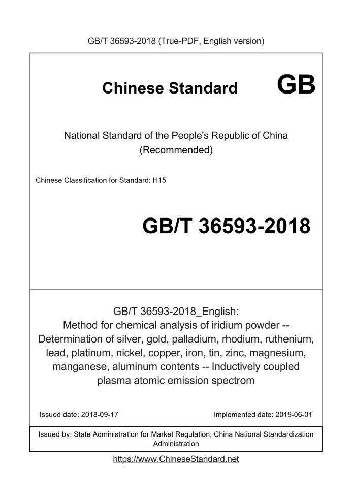 Delivery: <= 3 days. True-PDF full-copy in English will be manually translated and delivered via email. GB/T 36593-2018: Method for chemical analysis of iridium powder -- Determination of silver, gold, palladium, rhodium, ruthenium, lead, platinum, nickel, copper, iron, tin, zinc, magnesium, manganese, aluminum contents -- Inductively coupled plasma atomic emission spectrom Status: Valid