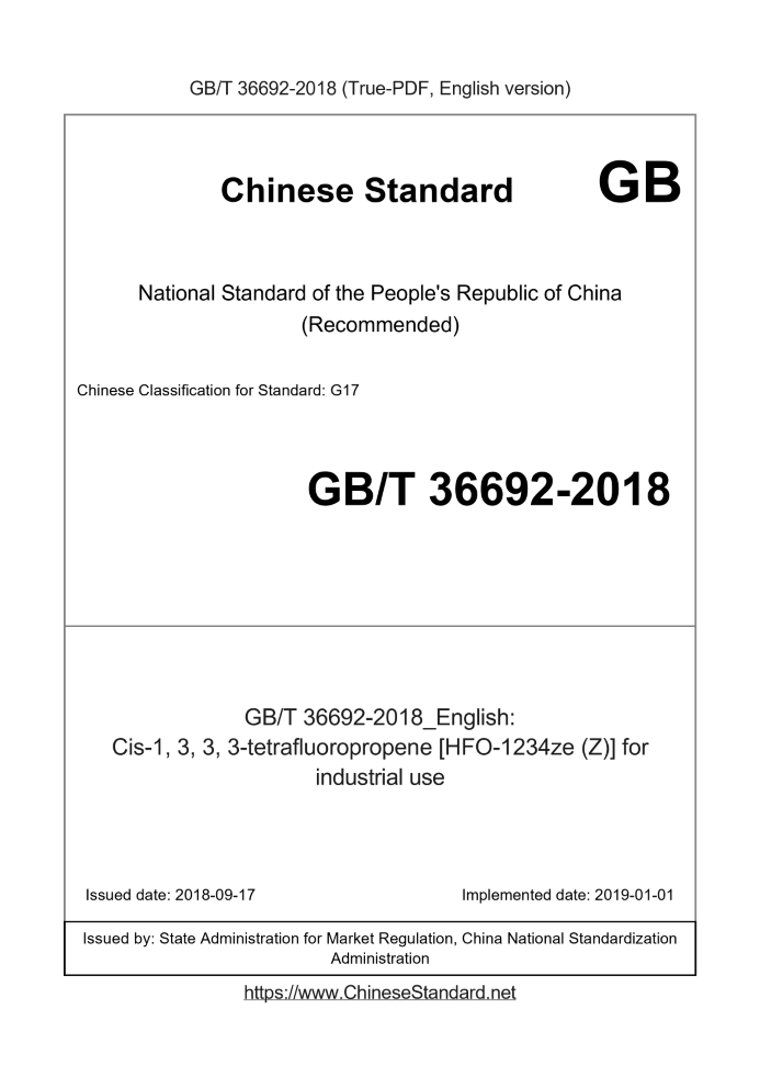 Delivery: <= 4 days. True-PDF full-copy in English will be manually translated and delivered via email. GB/T 36692-2018: Cis-1, 3, 3, 3-tetrafluoropropene [HFO-1234ze (Z)] for industrial use Status: Valid