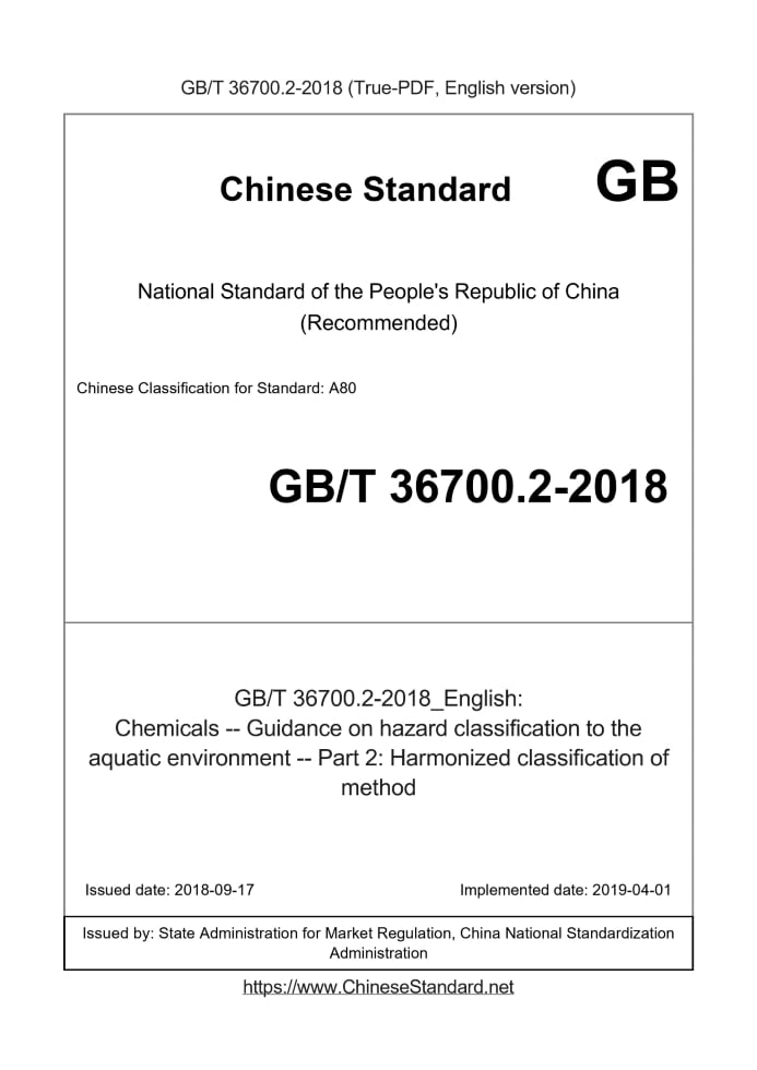 Delivery: <= 3 days. True-PDF full-copy in English will be manually translated and delivered via email. GB/T 36700.2-2018: Chemicals -- Guidance on hazard classification to the aquatic environment -- Part 2: Harmonized classification of method Status: Valid