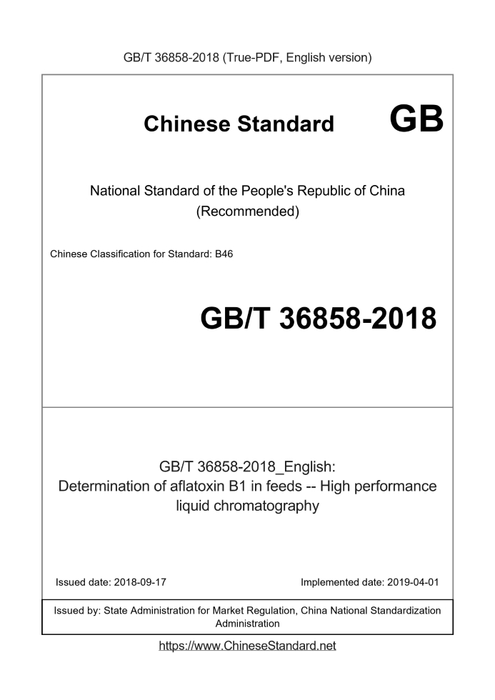 Determination of aflatoxin B1 in feeds - High performance liquid chromatography ICS 65.120 B46 National Standards of People's Republic of China Determination of aflatoxin B1 in feed High performance liquid chromatography Published on.2018-09-17 Implementation of.2019-04-01 State market supervision and administration China National Standardization Administration issued