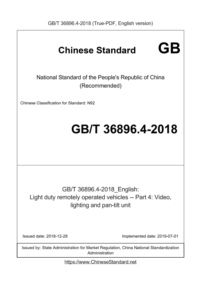 Delivery: <= 3 days. True-PDF full-copy in English will be manually translated and delivered via email. GB/T 36896.4-2018: Light duty remotely operated vehicles -- Part 4: Video, lighting and pan-tilt unit Status: Valid