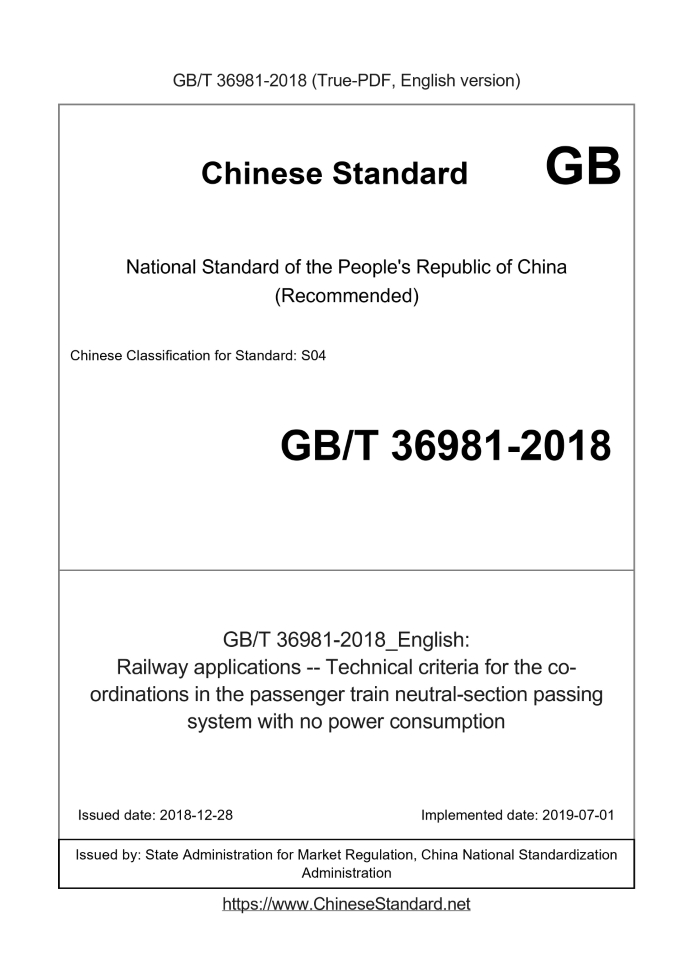 GB/T 36981-2018: Railway applications -- Technical criteria for the co-ordinations in the passenger train neutral-section passing system with no power consumption
