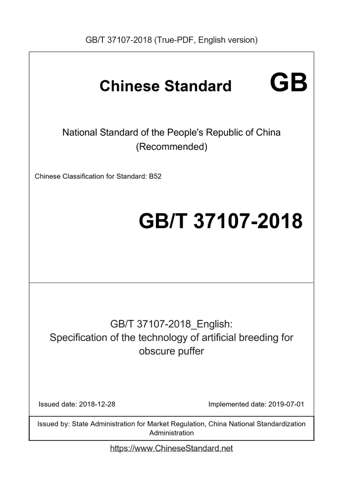GB/T 37107-2018: Specification of the technology of artificial breeding for obscure puffer