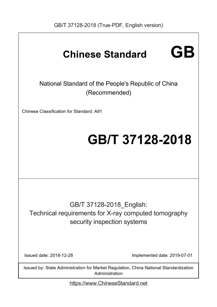 Delivery: <= 4 days. True-PDF full-copy in English will be manually translated and delivered via email. GB/T 37128-2018: Technical requirements for X-ray computed tomography security inspection systems Status: Valid