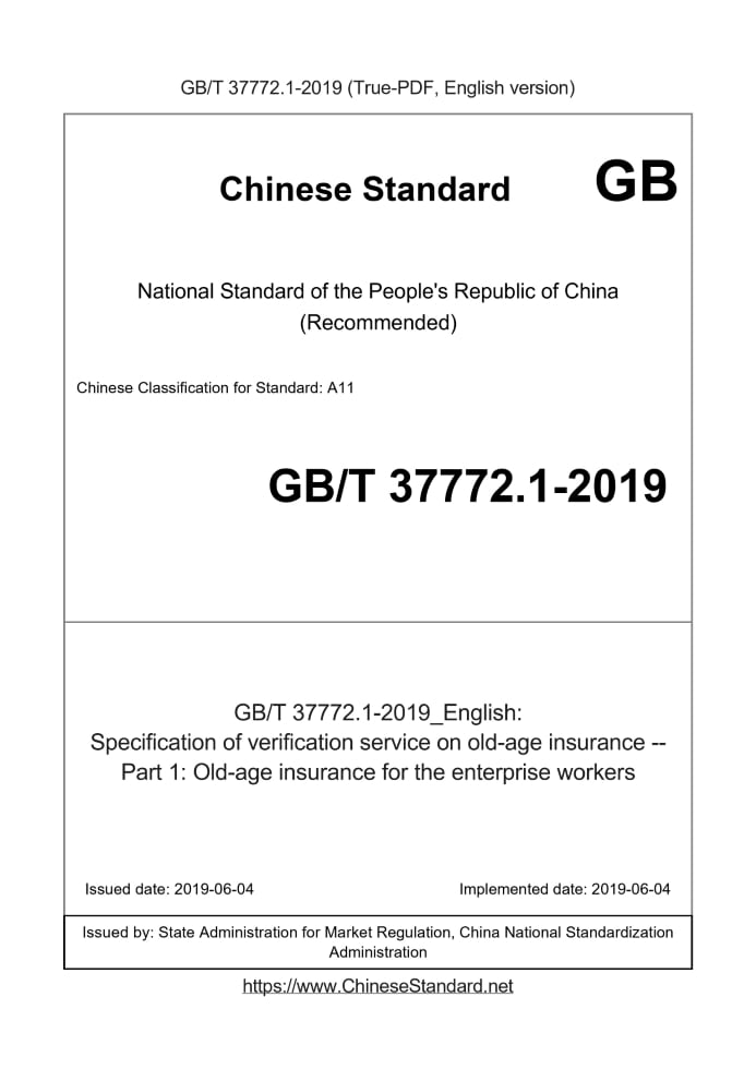 Delivery: <= 3 days. True-PDF full-copy in English will be manually translated and delivered via email. GB/T 37772.1-2019: Specification of verification service on old-age insurance -- Part 1: Old-age insurance for the enterprise workers Status: Valid