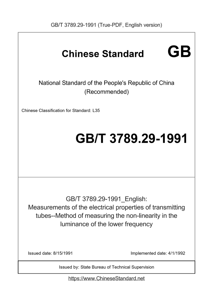 Delivery: <= 2 days. True-PDF full-copy in English will be manually translated and delivered via email. GB/T 3789.29-1991: Measurements of the electrical properties of transmitting tubes--Method of measuring the non-linearity in the luminance of the lower frequency Status: Obsolete