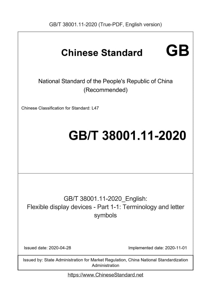 Delivery: <= 3 days. True-PDF full-copy in English will be manually translated and delivered via email. GB/T 38001.11-2020: Flexible display devices - Part 1-1: Terminology and letter symbols Status: Valid
