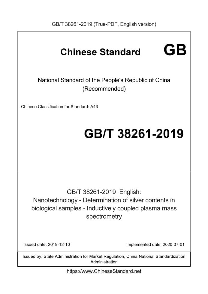 Delivery: <= 4 days. True-PDF full-copy in English will be manually translated and delivered via email. GB/T 38261-2019: Nanotechnology - Determination of silver contents in biological samples - Inductively coupled plasma mass spectrometry Status: Valid