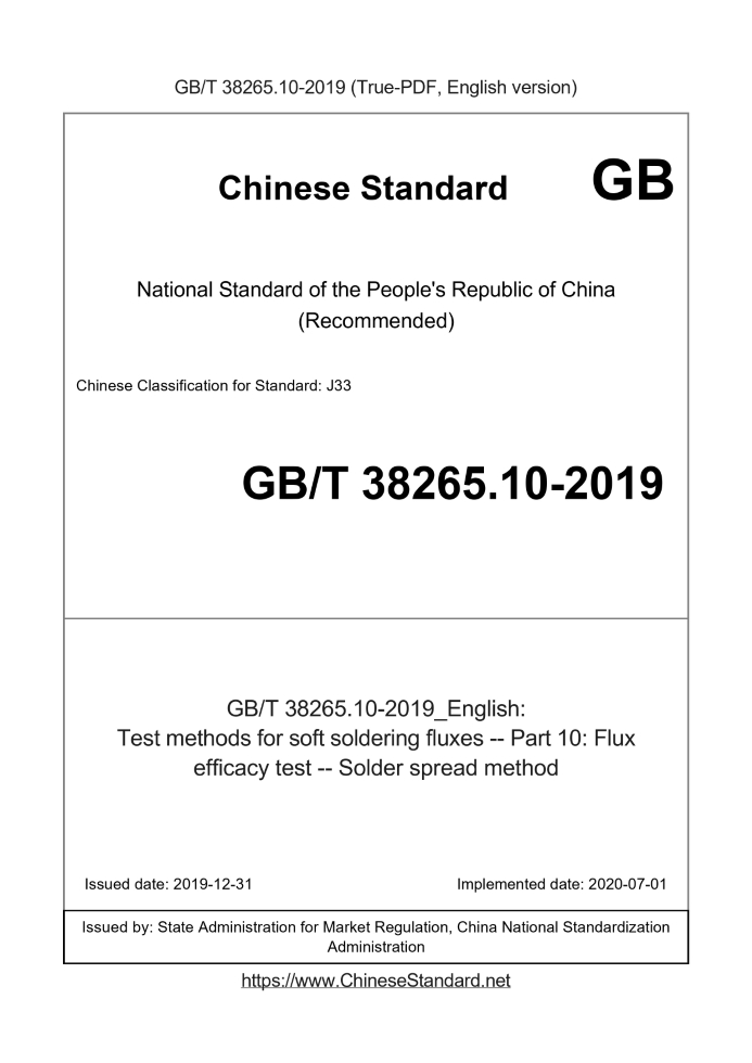 Delivery: <= 3 days. True-PDF full-copy in English will be manually translated and delivered via email. GB/T 38265.10-2019: Test methods for soft soldering fluxes -- Part 10: Flux efficacy test -- Solder spread method Status: Valid