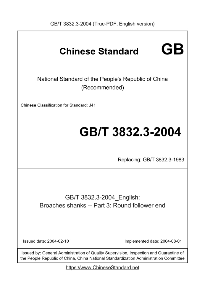 Delivery: <= 2 days. True-PDF full-copy in English will be manually translated and delivered via email. GB/T 3832.3-2004: Broaches shanks -- Part 3: Round follower end Status: Obsolete GB/T 3832.3: Historical versions