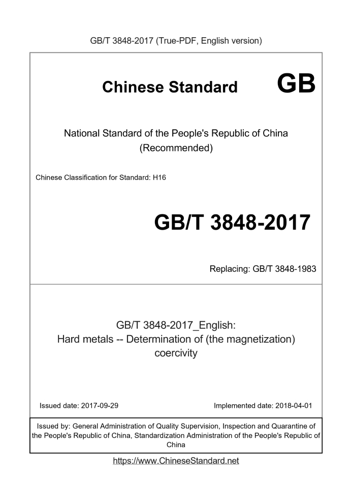 Delivery: <= 3 days. True-PDF full-copy in English will be manually translated and delivered via email. GB/T 3848-2017: Hard metals -- Determination of (the magnetization) coercivity Status: Valid GB/T 3848: Historical versions