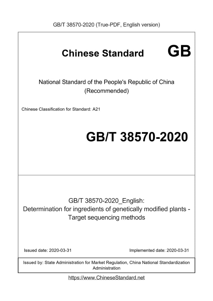 Delivery: <= 6 days. True-PDF full-copy in English will be manually translated and delivered via email. GB/T 38570-2020: Determination for ingredients of genetically modified plants - Target sequencing methods Status: Valid