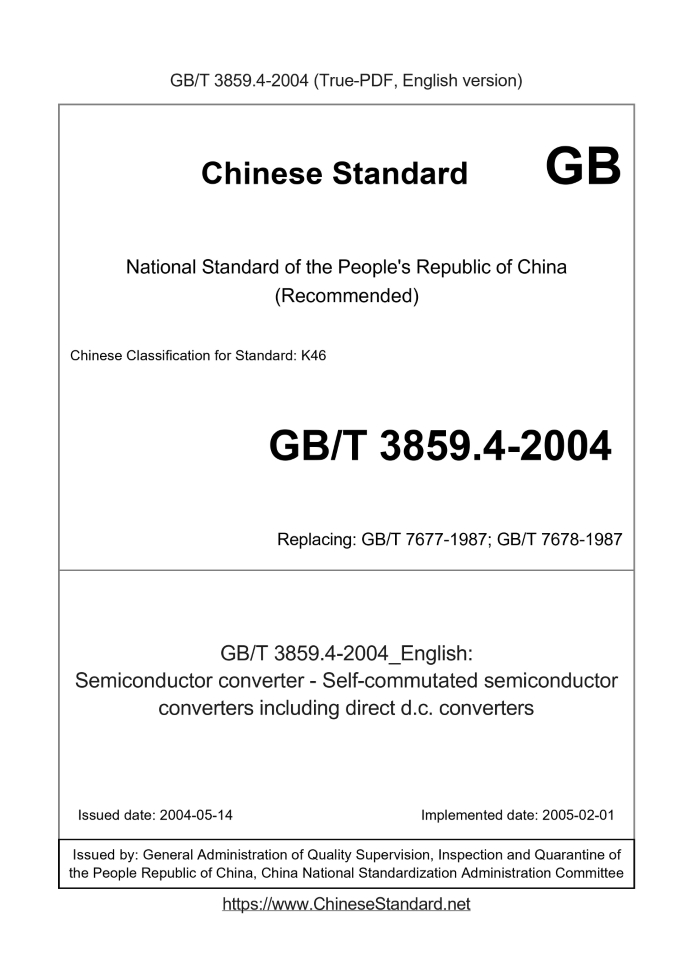 Delivery: <= 4 days. True-PDF full-copy in English will be manually translated and delivered via email. GB/T 3859.4-2004: Semiconductor converter - Self-commutated semiconductor converters including direct d.c. converters Status: Valid