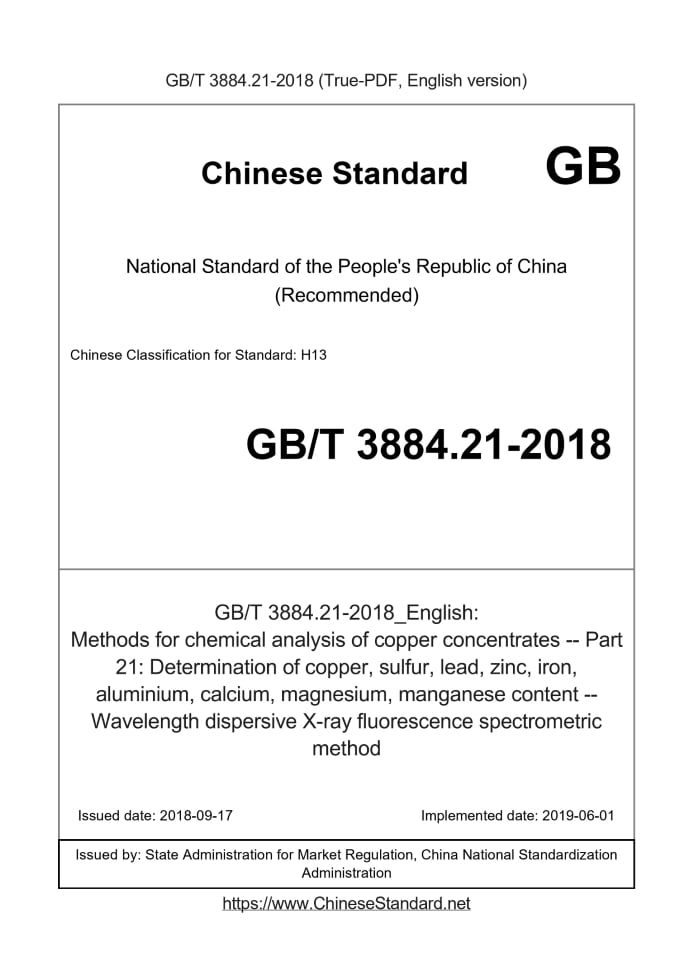 Delivery: <= 3 days. True-PDF full-copy in English will be manually translated and delivered via email. GB/T 3884.21-2018: Methods for chemical analysis of copper concentrates -- Part 21: Determination of copper, sulfur, lead, zinc, iron, aluminium, calcium, magnesium, manganese content -- Wavelength dispersive X-ray fluorescence spectrometric method Status: Valid