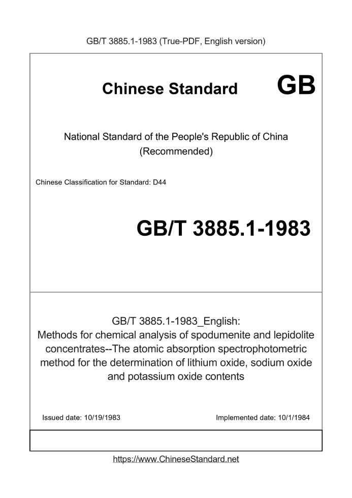 Delivery: <= 2 days. True-PDF full-copy in English will be manually translated and delivered via email. GB/T 3885.1-1983: Methods for chemical analysis of spodumenite and lepidolite concentrates--The atomic absorption spectrophotometric method for the determination of lithium oxide, sodium oxide and potassium oxide contents Status: Obsolete