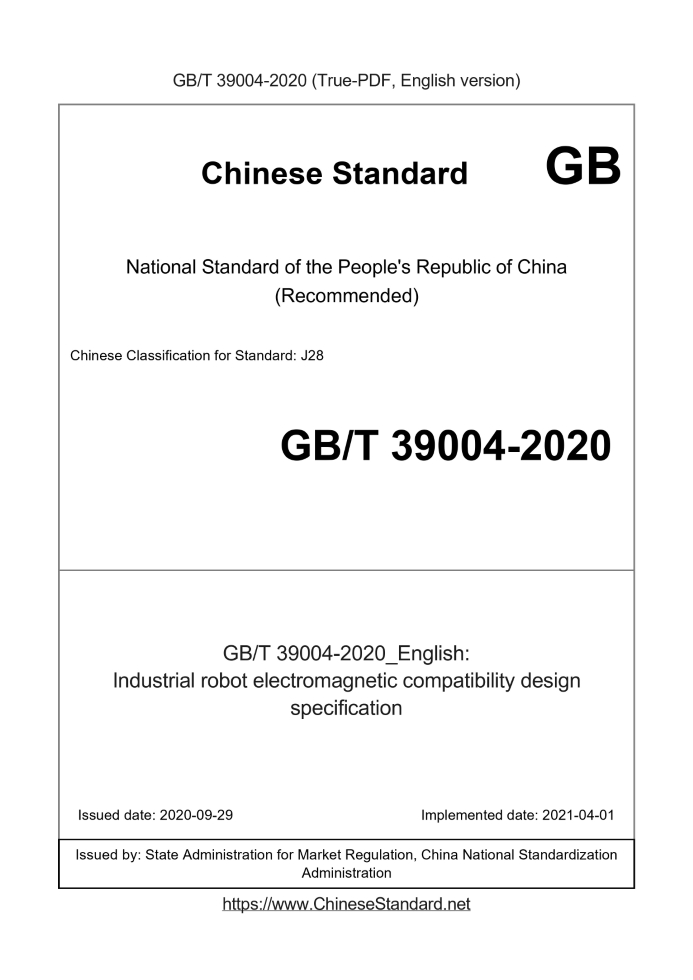 | GB/T 39004-2020 English PDFUS$489.00 · In stock Delivery: <= 5 days. True-PDF full-copy in English will be manually translated and delivered via email. GB/T 39004-2020: Industrial robot electromagnetic compatibility design specification Status: Valid