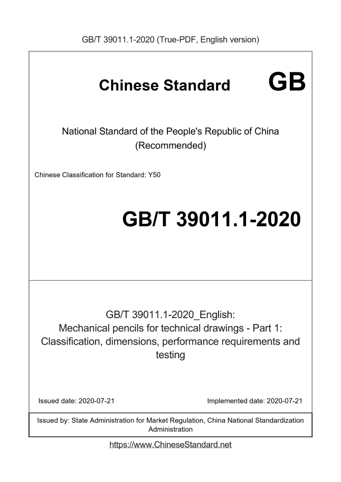 Delivery: <= 3 days. True-PDF full-copy in English will be manually translated and delivered via email. GB/T 39011.1-2020: Mechanical pencils for technical drawings - Part 1: Classification, dimensions, performance requirements and testing Status: Obsolete GB/T 39011.1: Historical versions