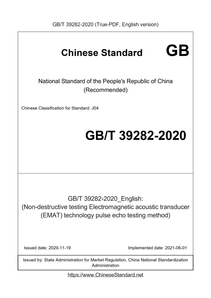 Delivery: <= 3 days. True-PDF full-copy in English will be manually translated and delivered via email. GB/T 39282-2020: (Non-destructive testing Electromagnetic acoustic transducer (EMAT) technology pulse echo testing method) Status: Valid