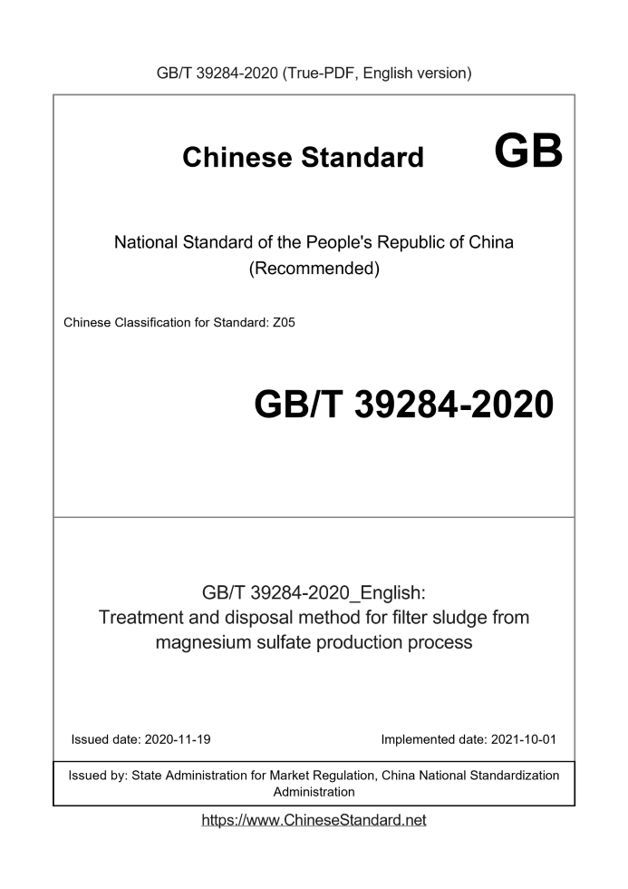Delivery: <= 3 days. True-PDF full-copy in English will be manually translated and delivered via email. GB/T 39284-2020: Treatment and disposal method for filter sludge from magnesium sulfate production process Status: Valid