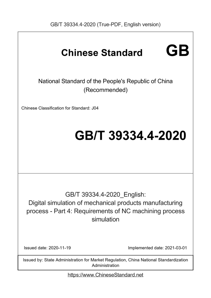 Delivery: <= 3 days. True-PDF full-copy in English will be manually translated and delivered via email. GB/T 39334.4-2020: Digital simulation of mechanical products manufacturing process - Part 4: Requirements of NC machining process simulation Status: Valid